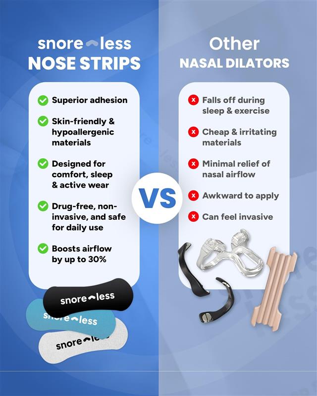 Snore-Less strips use flexible, semi-rigid support bars beneath the adhesive. When placed across the nose, they gently pull the nasal passages outward, lowering resistance and helping you breathe more easily through your nose.