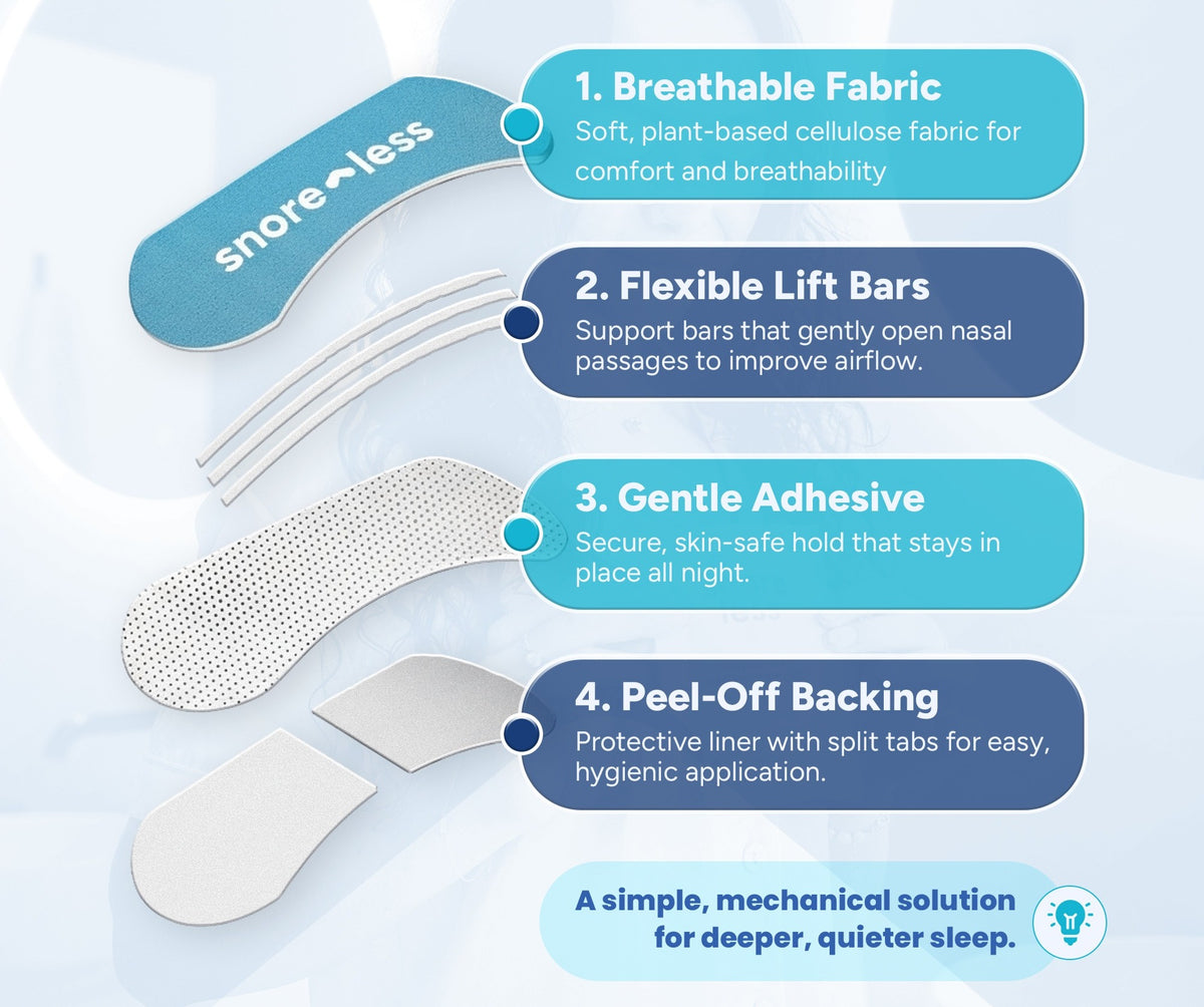 Snore-Less Nose strips use flexible, semi-rigid support bars beneath the adhesive. When placed across the nose, they gently pull the nasal passages outward, lowering resistance and helping you breathe more easily through your nose.