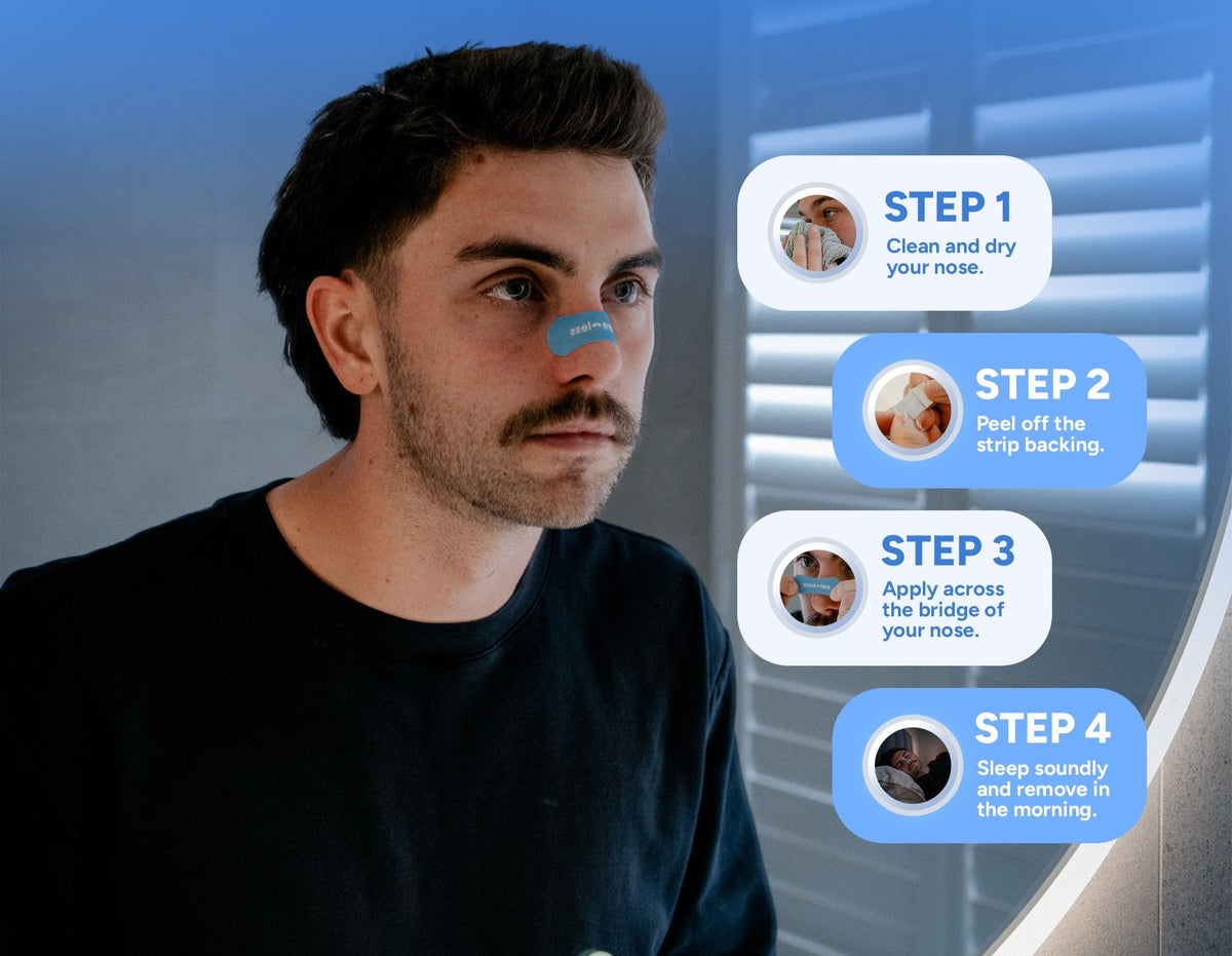 Clean your nose, peel, apply, slep. One quick step before bed for hours of clearer breathing, less snoring, and better recovery.