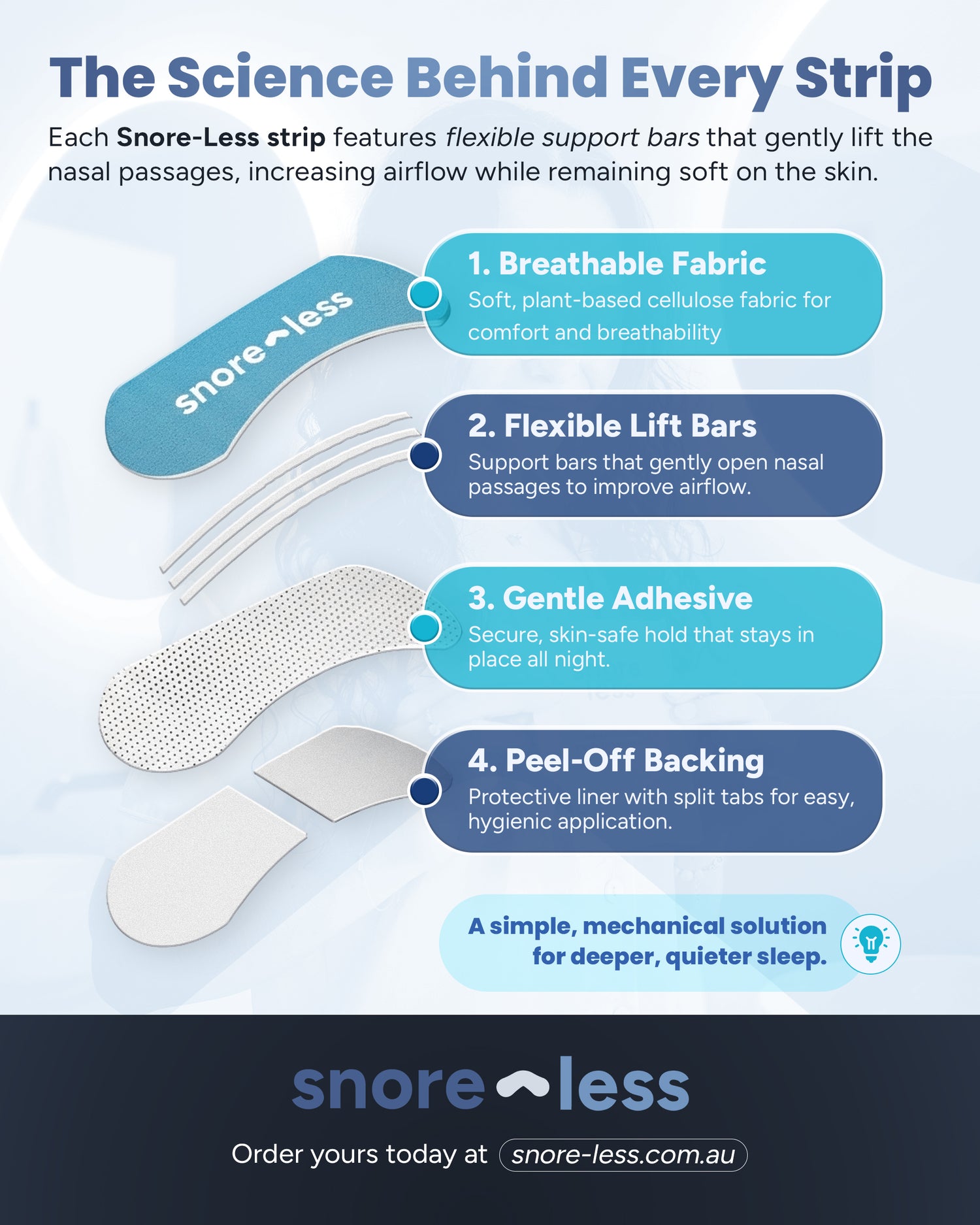 Our nose strips use soft, breathable fabric and flexible lift bars to gently open your nasal passages. With skin-safe adhesive and easy peel-off backing, they improve airflow for deeper, quieter sleep.